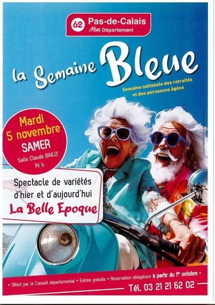 Comme chaque année, dans le cadre de la Semaine bleue, le Département offre un spectacle gratuit pour les personnes âgées et les retraités, qui aura lieu pour le territoire du Boulonnais le 5 novembre 2024 à Samer, salle Claude Bailly à 14 h.
